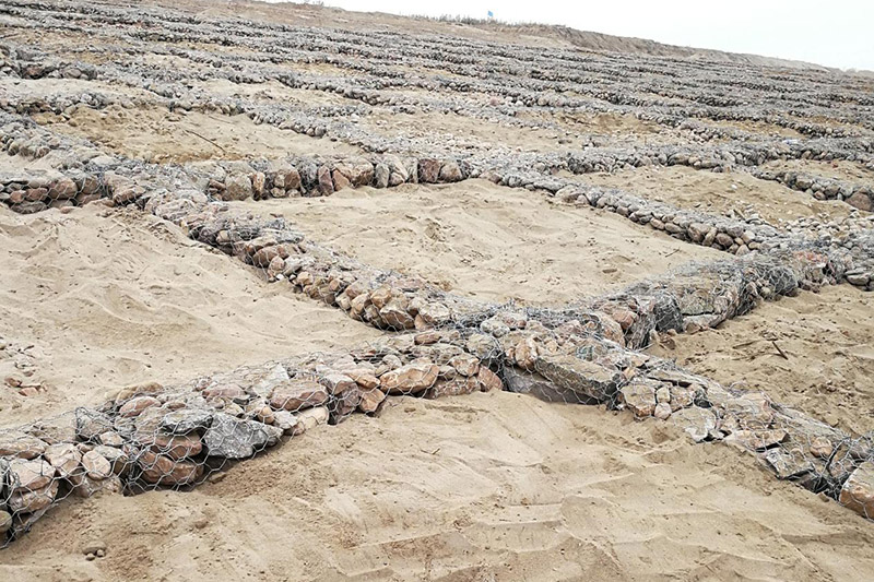 雷諾護(hù)墊箱是用鋼絲通過專用設(shè)備生產(chǎn)而成。在編織工藝中采用的是雙絞合六邊形金屬網(wǎng)格,因?yàn)椴捎昧诉@種特殊的編織方式,單個(gè)網(wǎng)格在發(fā)生破損時(shí),都不會(huì)引發(fā)相鄰的網(wǎng)格的破損。