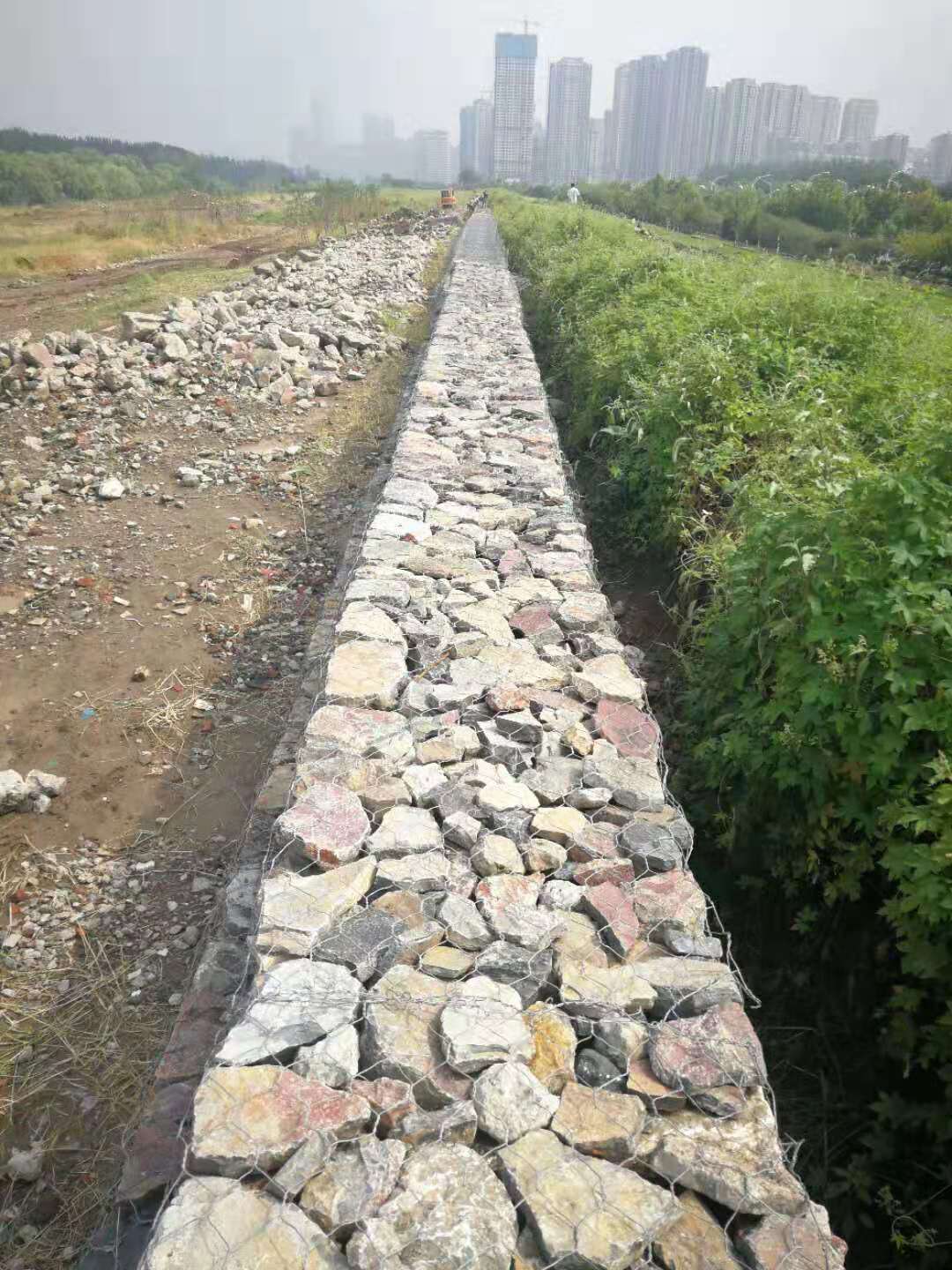 5.放置 綁好后,用機(jī)器小心將石籠網(wǎng)一個(gè)一個(gè)或兩個(gè)兩個(gè)的吊放到恰當(dāng)位置。為了保證質(zhì)量,石籠網(wǎng)縫邊、組裝時(shí)應(yīng)用較粗的邊絲和綁絲。