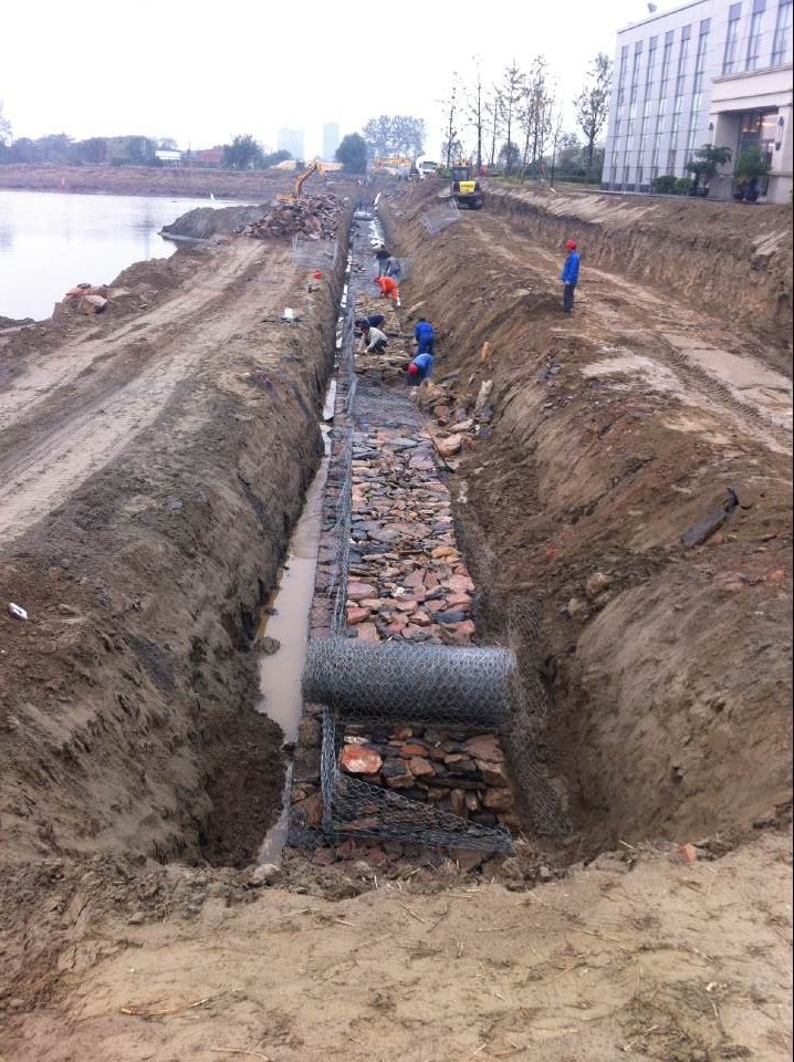 固濱籠是由經(jīng)表面防蝕處理的低碳鋼絲用機(jī)械編織的雙絞六角形柔性金屬網(wǎng)制成。將金屬網(wǎng)綁扎成不同結(jié)構(gòu)和尺寸的相互連接的網(wǎng)籠、網(wǎng)墊,填入適當(dāng)?shù)氖瘔K,然后綁扎蓋網(wǎng)形成的石籠、石墊整體護(hù)面。固濱籠為剛?cè)?/span>“板塊”。柔中帶剛,透水性好,有利于補(bǔ)充堤外水源。“板塊”可以抵抗坡面外水沖刷,也可排除內(nèi)水。