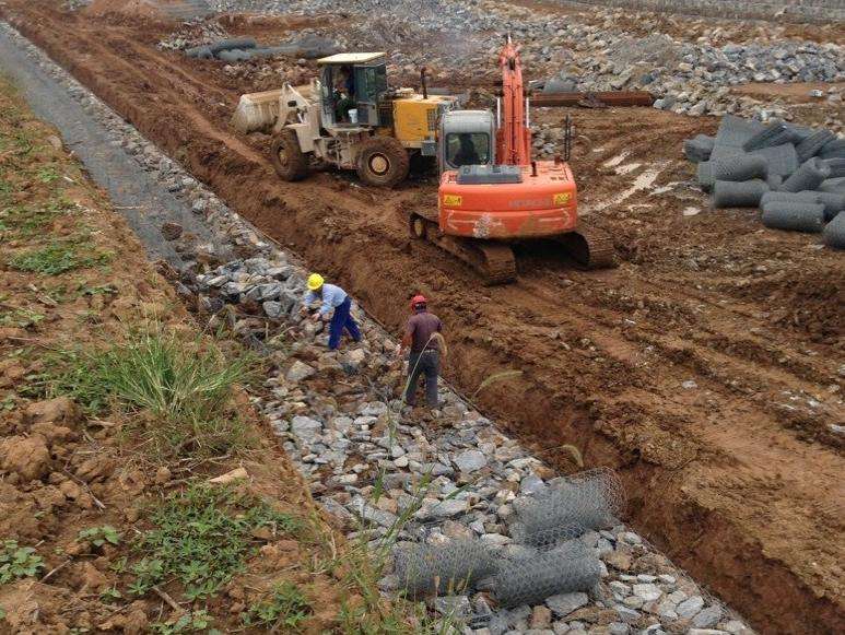 2 雷諾護(hù)墊施工過(guò)程應(yīng)符合如下要求: 雷諾護(hù)墊在鋪設(shè)前需進(jìn)行組裝 嚴(yán)格按照相關(guān)要求對(duì)護(hù)墊進(jìn)行展開(kāi)、對(duì)沒(méi)有折痕的隔板、邊板用人工折、 用 15cm 鋼絲絞合隔板與邊板交疊的地方 組裝好的雷諾護(hù)墊形狀規(guī)則、線條直順、絞合點(diǎn)牢固。 除極小的溝渠外護(hù)墊長(zhǎng)邊應(yīng)與坡面方向垂直; 當(dāng)護(hù)墊放在陡坡上(坡比大于 1:1.5) ,需用硬木樁在坡頂進(jìn)行 固定木樁入土深度至少應(yīng) 25cm,也可采用現(xiàn)澆混凝土平臺(tái)進(jìn)行固定;所有護(hù)墊必需緊靠、整齊、并且用短鋼絲固定相鄰護(hù)墊。 雷諾護(hù)墊的石料填充應(yīng)滿足以下要求 \裝填雷諾護(hù)墊所用的石料尺寸應(yīng)在 75mm~150mm; 當(dāng)使用大尺寸石料填充時(shí),應(yīng)根據(jù)雷諾護(hù)墊的高度確保至少裝填 兩層石料;石料裝填必需飽滿,并且達(dá)到設(shè)計(jì)厚度,特別注意每個(gè)方框的四 個(gè)角點(diǎn)以及坡上隔板上下兩端石料的裝填; 表面需要用人工進(jìn)行清平,將石料較為平整的面朝上,確保小到 每一個(gè)小方框,大到整個(gè)坡面,裝填完以后都在一個(gè)平面上,不存 在凸出和凹陷現(xiàn)象。