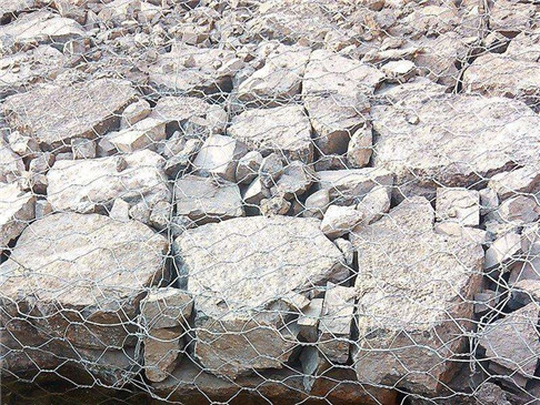 箱型石籠由大規(guī)格六角網(wǎng)聯(lián)結(jié)而成,施工中只需將石塊裝入籠中封口即可。