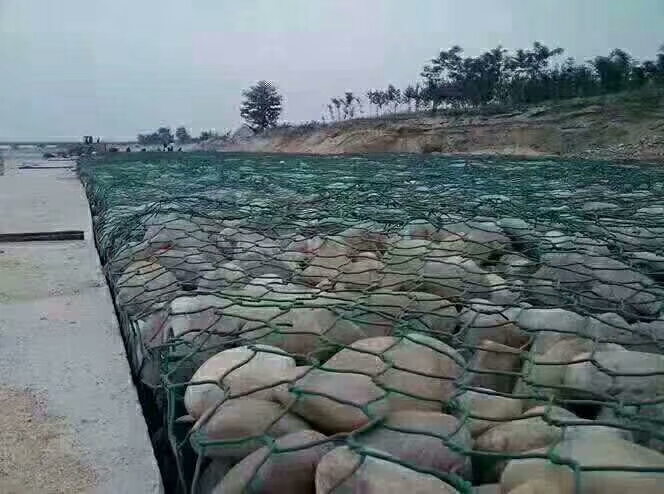 綠格網(wǎng)又稱“格賓網(wǎng)”、“石籠網(wǎng)”,由各種網(wǎng)孔規(guī)格的綠格網(wǎng)片按照ASTMA975-97規(guī)范組裝而成,工程現(xiàn)成填充石料組裝形成柔性的、透水的、整體的支擋結(jié)構(gòu),常用于生態(tài)防護工程。該結(jié)構(gòu)采用高熱鍍鋅鋼絲或者10%鋅鋁合金鋼絲經(jīng)過雙線絞合編織而成的,其雙線絞合部分的長度不能低于45mm,以保證絞合部分的防腐性能不被破壞。因為環(huán)境比較惡劣,污染比較嚴重,所以鋼絲的表面涂塑(包PVC或者PE)增強鋼絲的抗腐蝕性能。