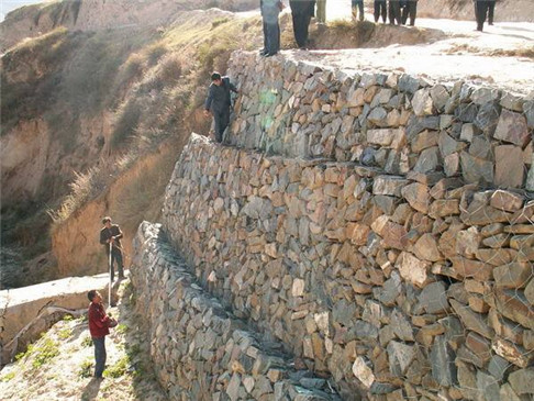 5.放置 綁好后,用機器小心將石籠網一個一個或兩個兩個的吊放到恰當位置。為了保證質量,石籠網縫邊、組裝時應用較粗的邊絲和綁絲。