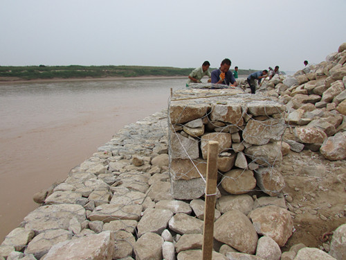 5.放置 綁好后,用機器小心將石籠網(wǎng)一個一個或兩個兩個的吊放到恰當(dāng)位置。為了保證質(zhì)量,石籠網(wǎng)縫邊、組裝時應(yīng)用較粗的邊絲和綁絲。